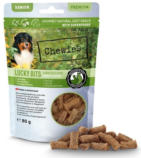 W Chewies LUCKY BITS nie znajdziesz żadnych zbóż ani dodatku cukru. Są produkowane w Szwajcarii - oczywiście bez inżynierii genetycznej i testów na zwierzętach.