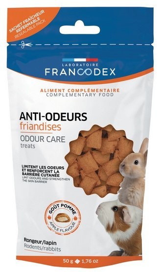 Karma uzupełniająca - przysmaki zapobiegające nieprzyjemnym zapachom sierści, moczu i trawienia, przeznaczone dla gryzoni i królików