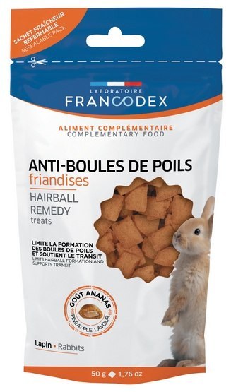 Okres linienia u królików sprzyja zakłaczeniu żołądka, co może mieć poważne konsekwencje i prowadzić nawet do zatrzymania pasażu. Przekąski zapobiegające zakłaczeniu FRANCODEX zawierają słód i papaję, które stymulują pasaż przewodu pokarmowego i ograniczają zakłaczenie, a także inulinę, która wspomaga utrzymanie odpowiedniej flory jelitowej. Ponadto przekąski są wyjątkowo apetyczne dzięki aromatowi ananasa.