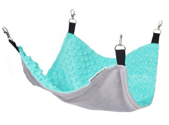 Hamak 35 x 40 cm z serii Candy na elastycznej taśmie z 4 karabińczykami. Jest to idealny mebel dla gryzonia. Dzięki prostokątnej formie i większym rozmiarom znajdzie zastosowanie w większej klatce. Hamak w klatce dla gryziona to idealne miejsce na sen i zabawę. By ułatwić montaż i demontaż, hamak wyposażony jest w 4 karabińczyki. Wykorzystanie oraz mocowanie hamaku dowolne, jednak jeśli hamak zostanie powieszony odpowiednio nisko od podłogi, spełni on dodatkową funkcję norki. Taśmy amortyzują hamak, dzięki czemu są bardziej wytrzymałe i bezpieczne. Materiał podstawy to przyjemny w dotyku plusz, natomiast górna tkanina to błękitny plusz z mięciutkimi wypustkami.