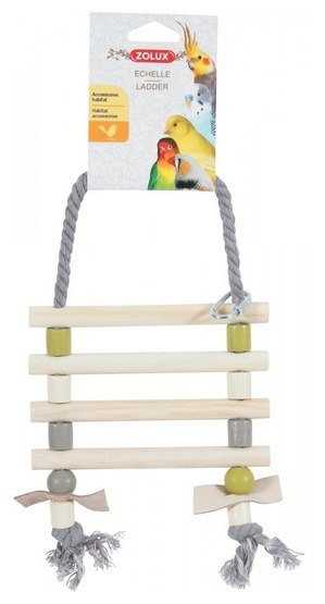 Drabinka na sznurku to idealny dodatek do klatki dla ptaków. Posiada 4 drewniane szczebelki, kolorowe koraliki oraz elementy ze skóry. Drabinkę wyposażono w praktyczny karabińczyk, dzięki czemu z łatwością można przymocować ją do prętów klatki. Zabawka ta nie tylko dostarcza zwierzęciu rozrywki, ale także stymuluje je intelektualnie i urozmaica przestrzeń klatki.