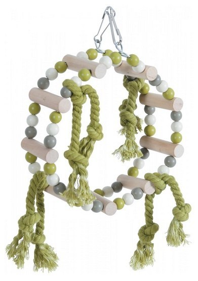 Huśtawka w kształcie obręczy z koralików, z drewnianymi szczebelkami i sznureczkami to idealny dodatek do klatki dla ptaków. Zapewni zwierzęciu dużo rozrywki, dostarczy stymulacji intelektualnej i urozmaici jego otoczenie.